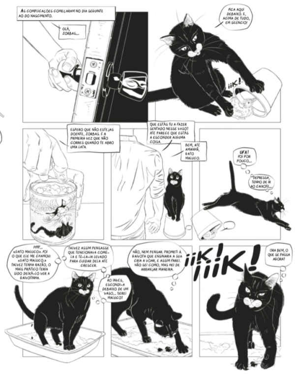 No que diz respeito à arte, Cever apresenta-nos desenhos a preto e branco, com um traço fino. Apesar de apreciar a delicadeza do estilo, especialmente na representação dos animais, devo ressalvar que, por vezes, as expressões dos gatos são um pouco exageradas e humanizadas, o que pode quebrar ligeiramente a imersão na narrativa.