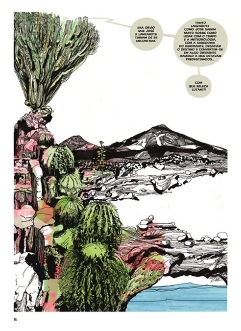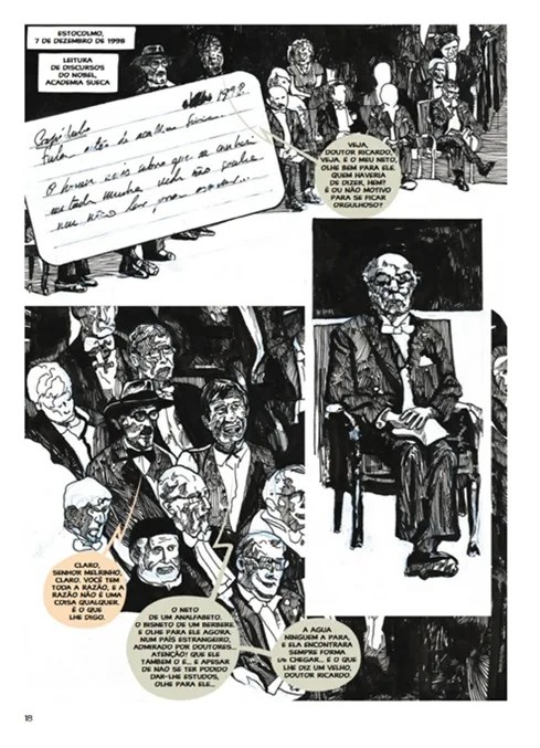 Contudo esta obra não cumpre totalmente o seu objetivo de relatar a vida do escritor. Sobre a forma de diálogo entre o avô de Saramago e o heterónimo de Fernando Pessoa, Ricardo Reis, vamos avançando na vida do autor, descobrindo as suas memórias e acontecimentos de forma indireta. O livro tem uma estética que está mais próxima do livro ilustrado do que da Banda Desenhada convencional, mas que se enquadra perfeitamente nas definições de Arte Sequencial. Numa entrevista, Guerrero disse que tinha três guias: Leonard Cohen, Saramago e Sergio Toppi, este último facilmente identificável pela sua influência evidente em toda a obra.