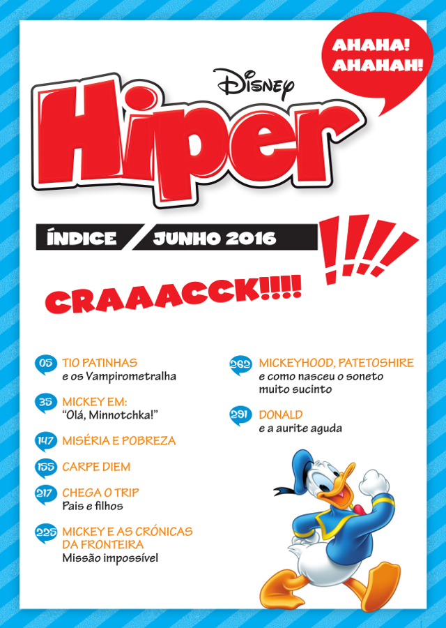 Agarra-te bem ao assento do sofá porque esta edição da Hiper vai prender a tua atenção do início ao fim e vai estar repleta de histórias vertiginosas!!! Como podes ver pela capa, o Donald, tal qual verdadeiro cowboy, já se pôs a caminho com destino à aventura sem limites!!! E poderíamos começar de melhor forma do que na companhia do tio mais famoso de Patópolis?! O Tio Patinhas tenta, uma vez mais, defender o seu património dourado dos amigos do alheio, da melhor forma que sabe! Desta feita, novas ameaças surgem, com os vampirometralha a perigarem a solidez e robustez da fortuna do nosso tio avarento… Força, Patinhas! Para saberes mais sobre esta misteriosa história, só mesmo lendo Tio Patinhas e os vampirometralha!!! A figura Disney mais icónica também está de regresso, uma vez mais, com uma forma “sui generis” de apresentar uma história aos quadradinhos: são as histórias às tiras! O Mickey apresenta-te, em Paris, uma nova e perigosa rival. Para perceberes melhor o que estamos a dizer, só mesmo lendo Mickey em: “Olá, Minnotchka!”. Mas o melhor é mesmo vivermos o dia a dia, sem pensarmos no amanhã. Não é, Superpato?! Pelo menos, é isso que nos diz o título de mais uma nova história do Superpato: Carpe Diem! Depois dos super-heróis, as dimensões paralelas. As crónicas da fronteira voltam, com as suas aventuras espaciais a fazerem inveja às melhores ficções científicas! Missão impossível é o que nos promete o título. Será mesmo assim??? Não percas estas e outras histórias na tua Hiper de sempre![fbshare]