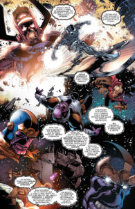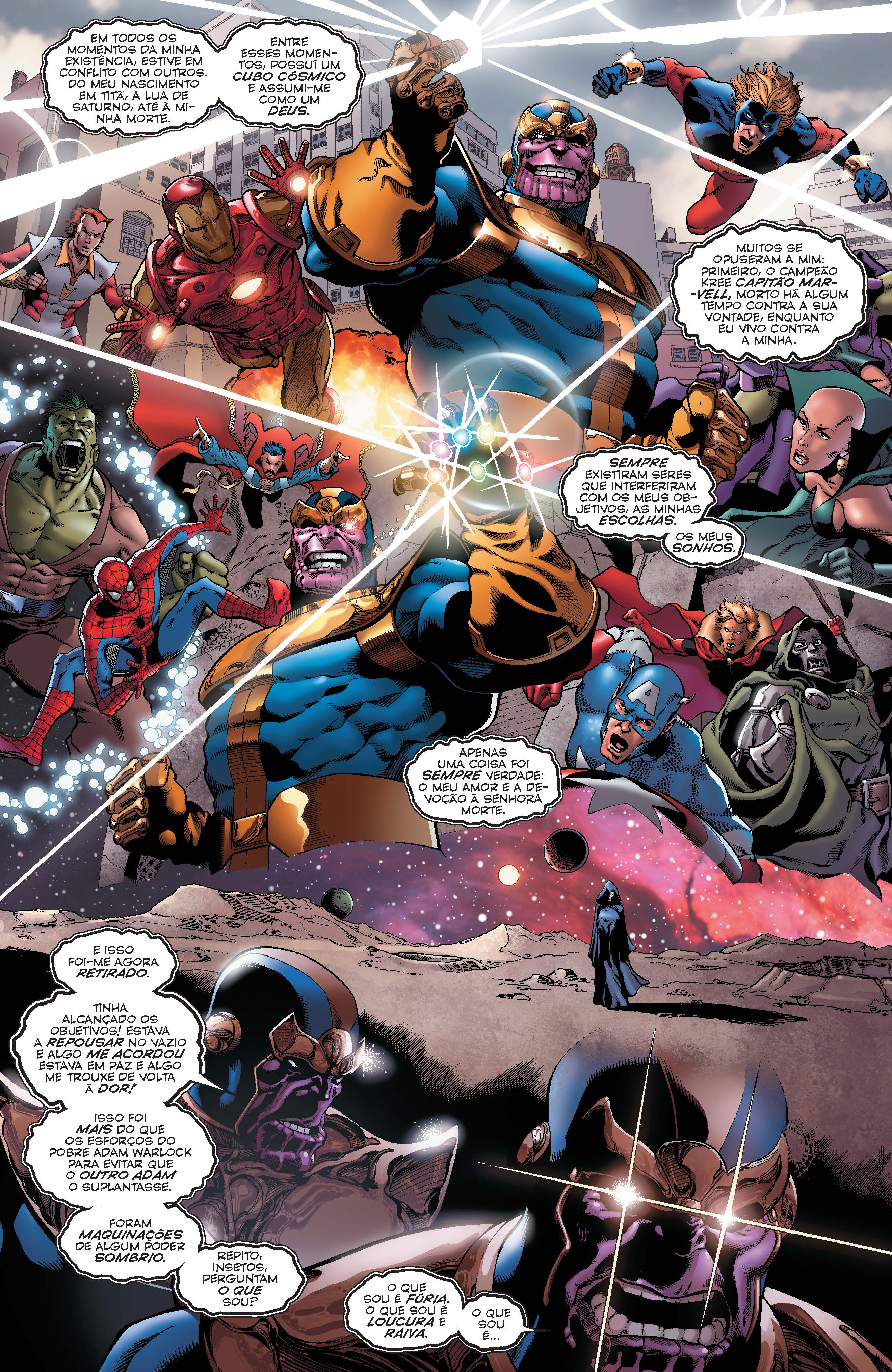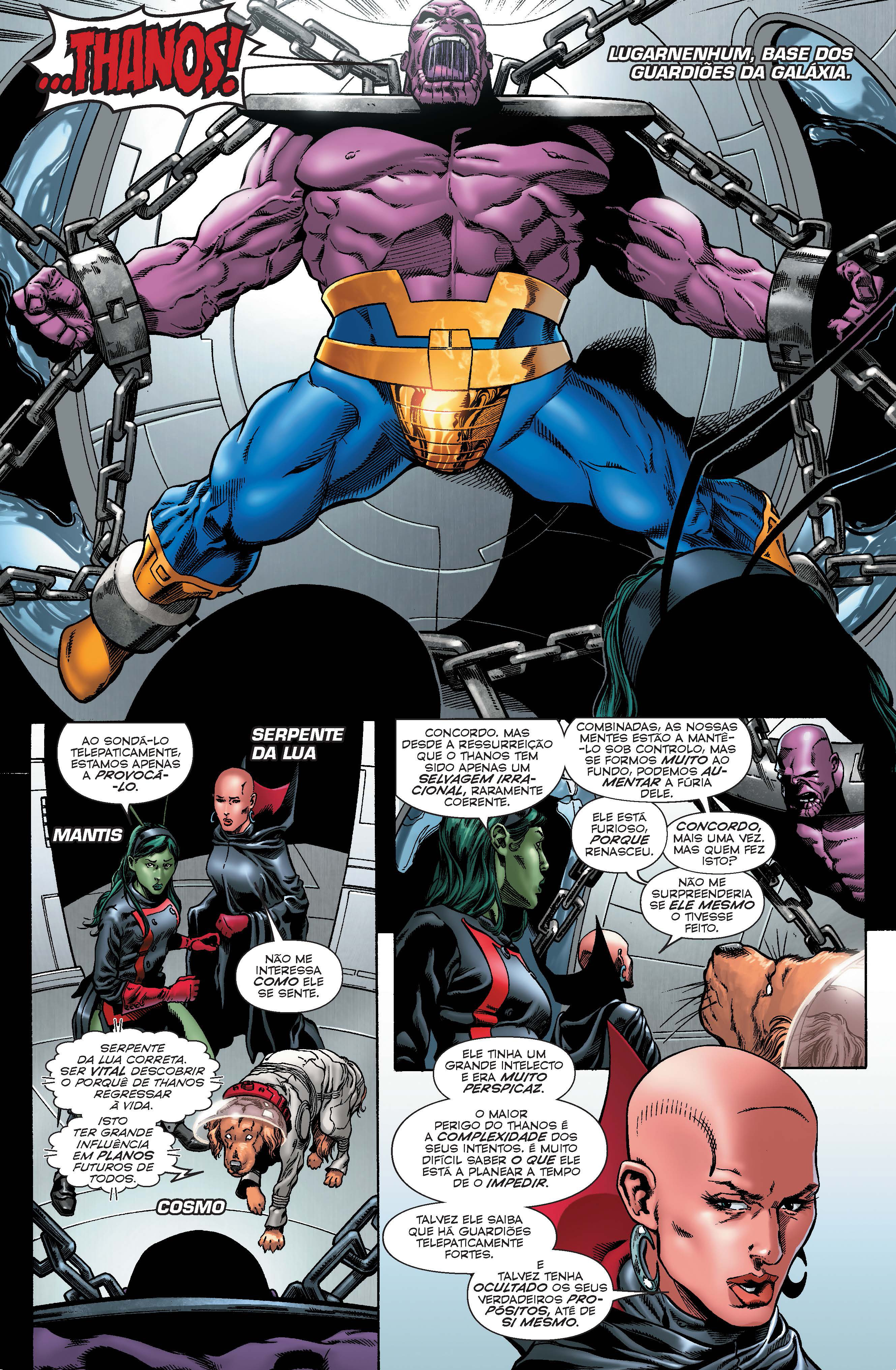 “A Falha — um rasgão entre universos — voltou a abrir e libertou um horror pior do que todos até agora. Vindos de um domínio conhecido como Cancroverso, Lorde Mar-Vell e as suas forças demoníacas e imortais lideram uma cruzada para escravizar tudo e todos. Perante probabilidades impossíveis, os Guardiões da Galáxia idealizam um plano desesperado para deter a conquista do guerreiro Kree corrupto. Plano que significa unir esforços com o maior vilão cósmico de sempre – nem mais, nem menos do que o Titã louco, apaixonado pela Morte: Thanos!”