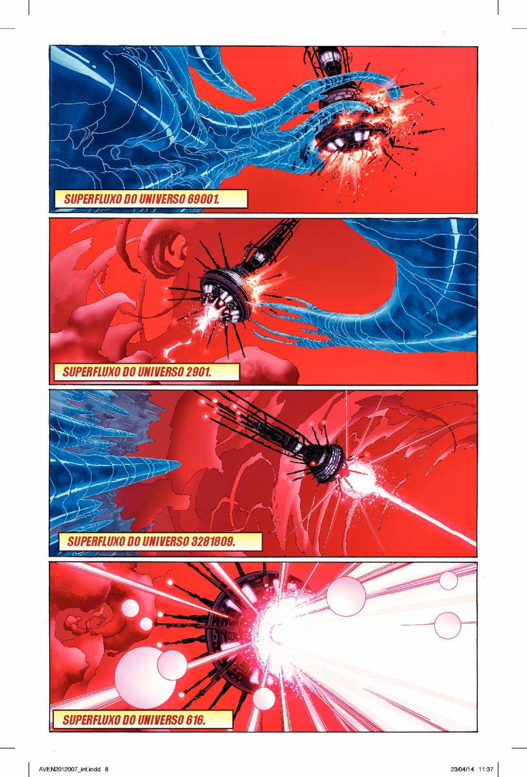 O terceiro arco de histórias de Jonathan Hickman recebe um ilustradores novo: nada menos do que excepcional ilustrador de SHIELD, Dustin Weaver. É o retorno do Novo Universo, e está prestes a colidir com a nossa! Eis o Evento Branco, um evento que só pode levar à destruição do planeta … ou à sua transformação.