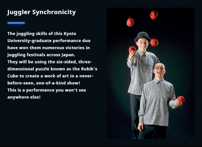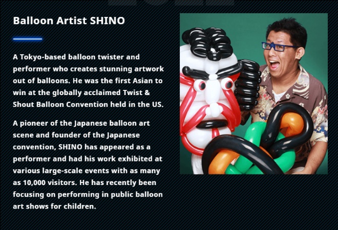 Pioneiro da arte do balão e o primeiro asiático a vencer na aclamada Convenção de Balão Twist & Shout, realizada nos EUA, SHINO vai representar personagens de “DRAGON BALL” com balões, e o vencedor do Festival de Malabarismo do Japão, a talentosa dupla de malabarismos, a Synchronicity vai usar 3.000 Cubos de Rubik para criar o principal visual do evento.