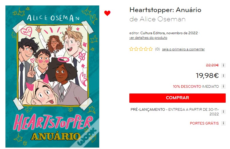 é o presente perfeito para quem ama as bandas desenhadas ou a adaptação da Netflix do universo criado pela Alice Oseman, autora bestseller e vencedora do YA Book Prize. Este volume a cores está repleto de conteúdo exclusivo do universo Heartstopper incluindo ilustrações nunca antes vistas, uma mini-BD exclusiva, perfis de todas as personagens, muitas curiosidades, uma viagem ao progresso artístico da autora e dicas sobre o seu processo criativo, tudo narrado por uma versão cartoon da própria Alice!