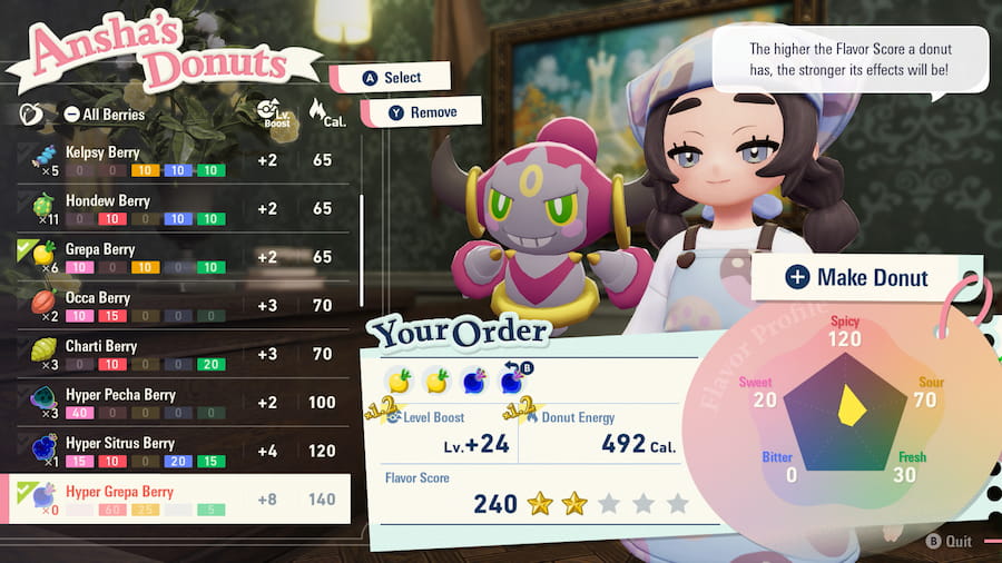 O sistema de criação de donuts é inteligente no conceito e cansativo na prática. Tal como as sanduíches de Scarlet e Violet, os donuts oferecem bónus relevantes: melhores drops, melhorias de combate e, em particular, maiores probabilidades de encontrar Pokémon Shiny e Alpha. Para completistas, isto é ouro. Para todos os outros, cozinhar um donut de cada vez, ao estilo de Animal Crossing, testa rapidamente a paciência. Ingredientes de topo estão bloqueados por níveis de investigação, pelo que os melhores bónus só são alcançados após um investimento de tempo significativo.