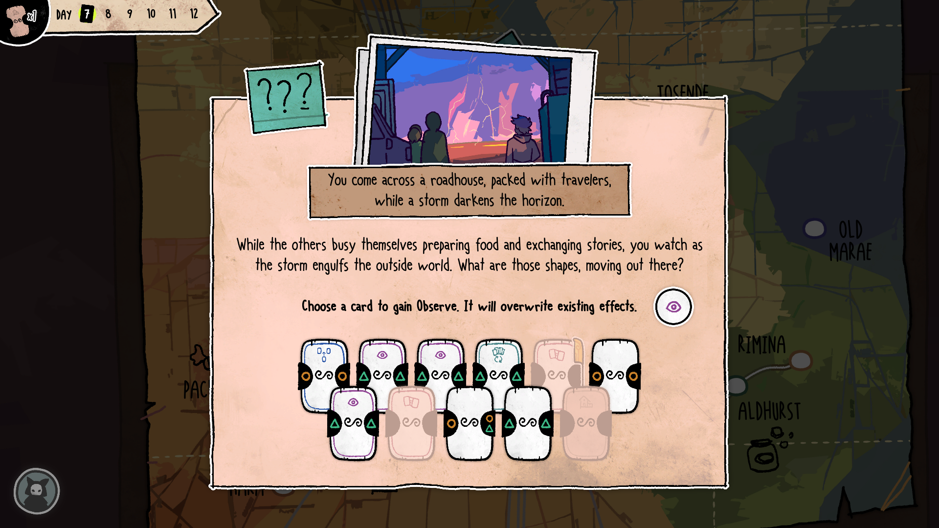 No entanto, o sistema de criação de laços e relações é o que me deixou mais desanimado neste jogo. Funciona da seguinte forma: selecionamos uma personagem para conversarmos e vamos colocando cartas de forma a criar encadeamento na conversa. Existem várias combinações de cartas no nosso baralho e vamos adquirindo mais ao longo de cada conversa, mas, só há duas saídas destas conversas: caixas brancas que significam que estamos a corresponder de forma certa às cartas dos nossos “novos amigos”, o que quer dizer que a conversa está a correr bem e laços bons estão a ser forjados ou caixas pretas que, naturalmente, significam conversas que estão a correr mal devido a não estarmos a corresponder ao que aos nossos companheiros de conversa nos colocam à frente. Estas conversas vão moldando a nossa jornada podendo assim desbloquear caminhos especiais ou até itens.