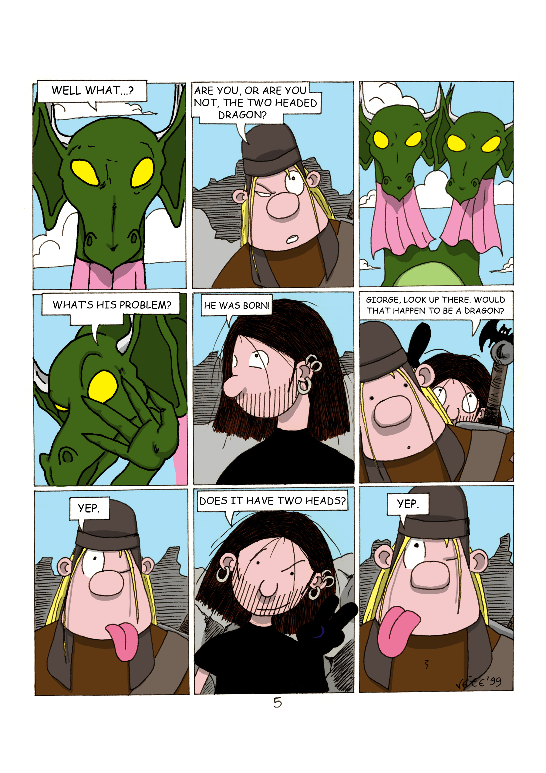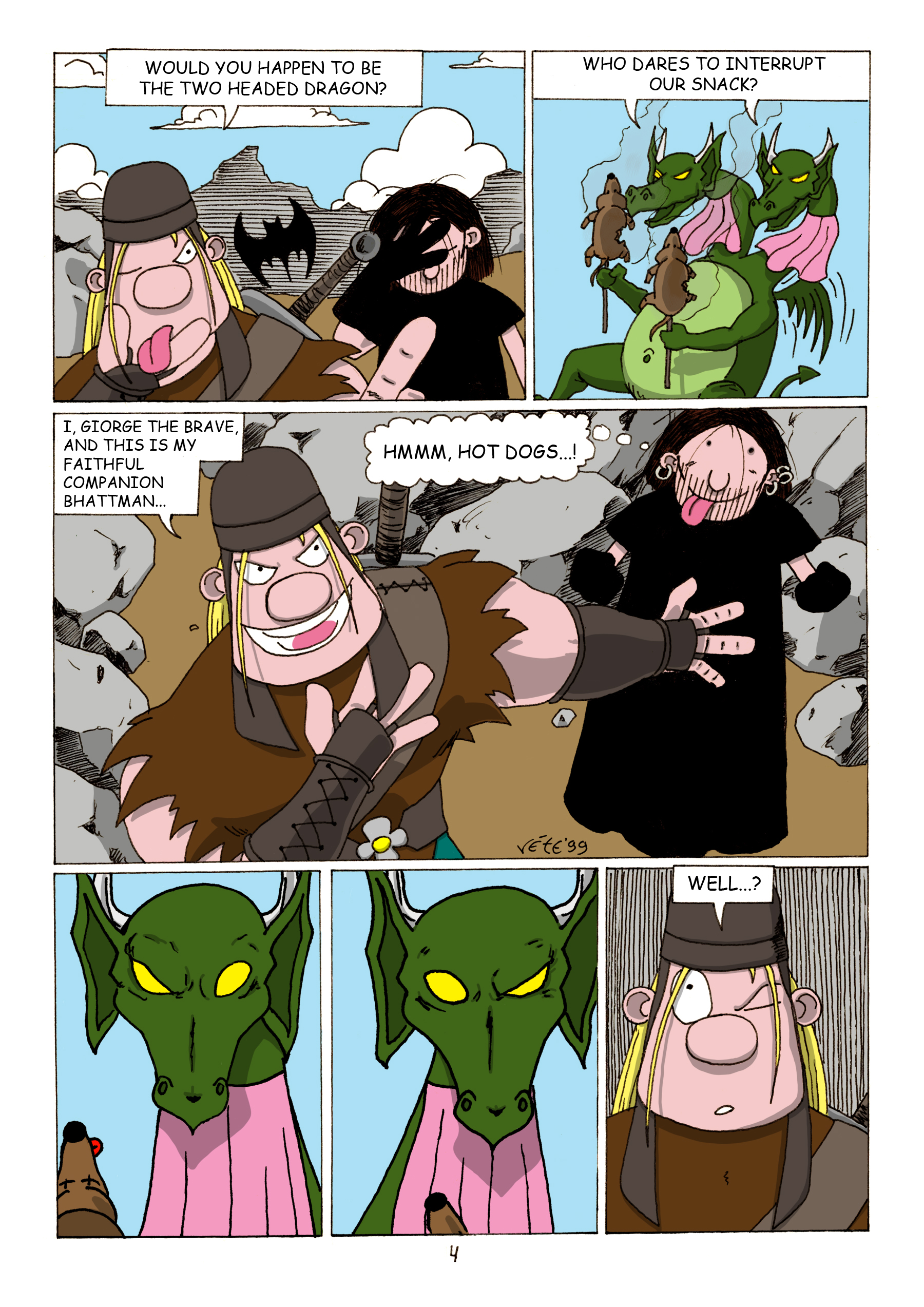 Imagina um guerreiro, alto, forte, corajoso, inteligente … bem … essa história não tem nada disso. Giorge é um idiota que serve como mercenário, completando missões com mais sorte do que astúcia… e talvez alguma ajuda de seu fiel companheiro! Nesta primeira aventura, ele terá que enfrentar um dragão com duas cabeças, um porteiro que também não é muito inteligente, e um cavaleiro que não percebe que as donzelas sequestradas não são muito bem vistas pela sociedade hoje em dia…