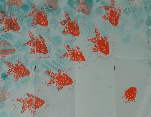 (ilustração dos peixes foi produzida com gravura e stencil pela estudante Sara Pires da licenciatura em Ilustração e Desenho do IPLuso