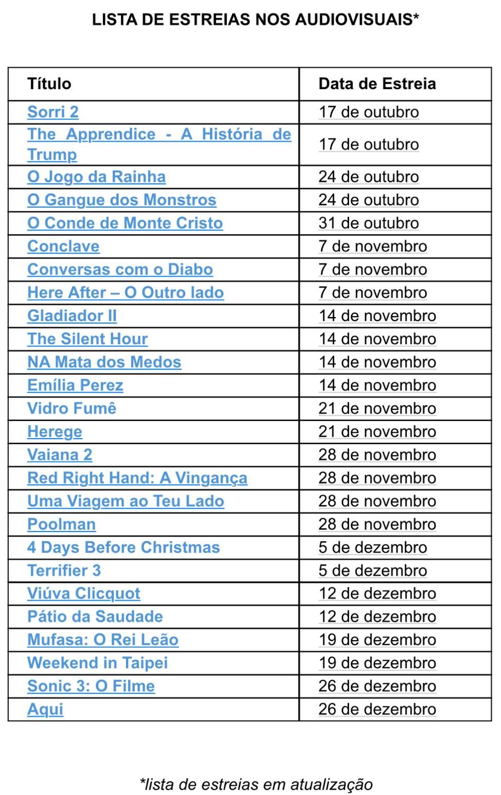 A distribuidora NOS Audiovisuais prepara-se para estrear mais de 30 filmes nas salas de cinema portuguesas até ao final do ano. Os tão aguardamos filmes ‘Sorri 2’, ‘Gladiador II’, ‘Conclave’, ‘Vaiana 2’, ‘Mufasa: O Rei Leão’, ‘Sonic 3: O Filme’ e ‘Aqui’, são alguns dos grandes títulos que a NOS Audiovisuais vai fazer chegar às salas de cinema, até ao final do ano