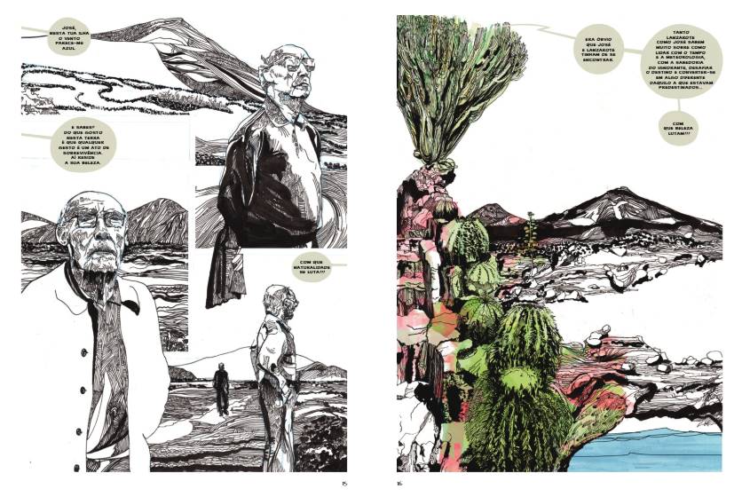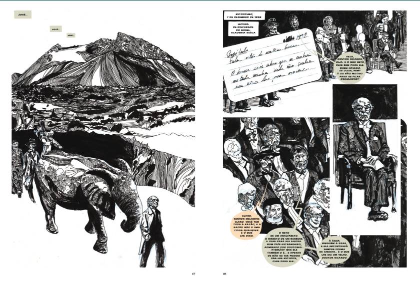 É a partir desta figura marcante, Jerónimo Melrinho, avô de Saramago, que se constrói a narrativa. Neste romance gráfico, o avô acompanha Ricardo Reis, o heterónimo de Fernando Pessoa integrado no universo literário saramaguiano, numa viagem pela vida do autor — da infância na Azinhaga do Ribatejo até aos seus últimos anos em Lanzarote. Esta abordagem ficcional e poética cria uma ponte singular entre memória, biografia e imaginação.