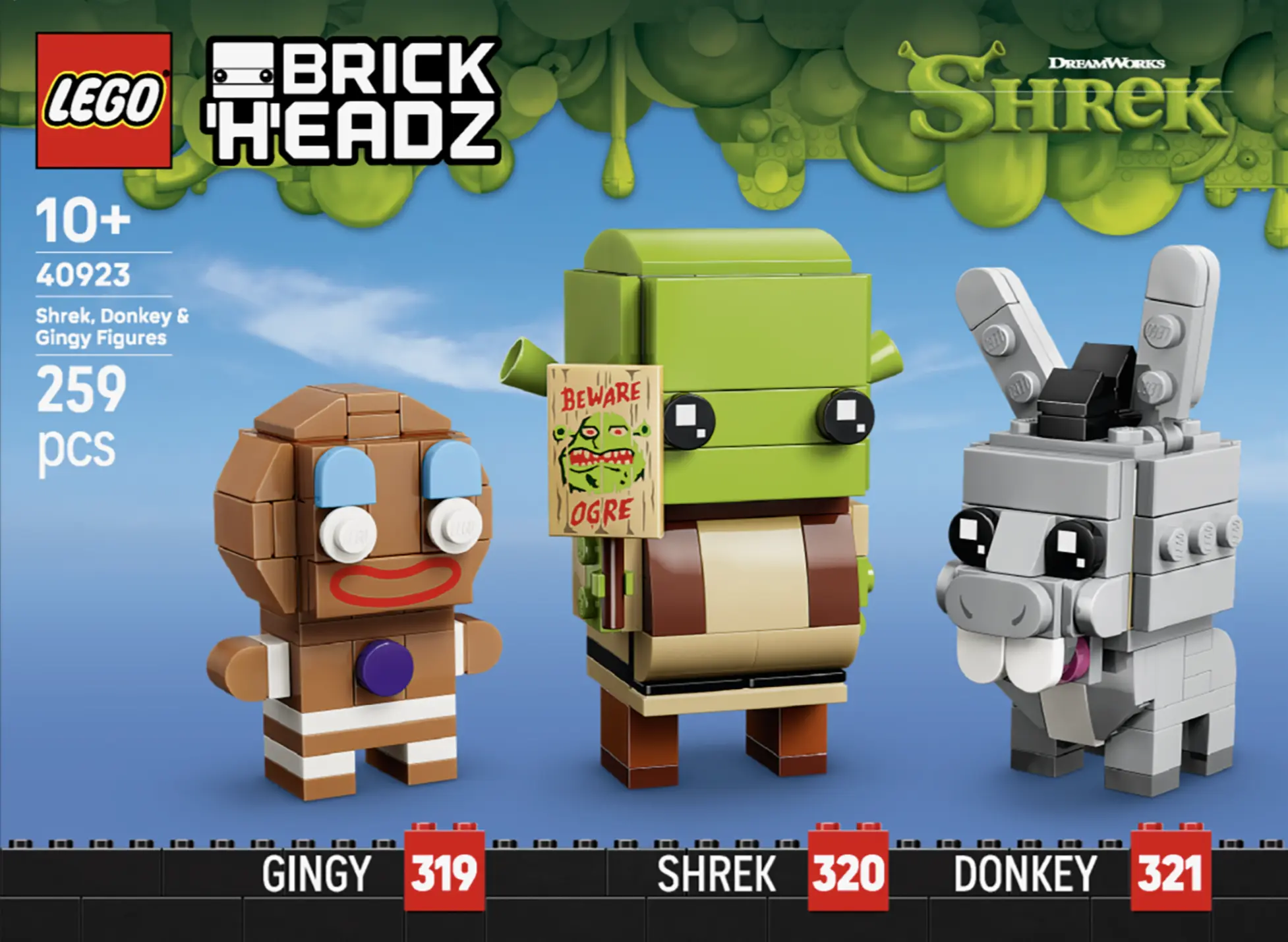 Para construtores mais jovens, o set LEGO BrickHeadz™ de Shrek convida as crianças de 10 anos em diante a entrarem no mundo de Bué, Bué Longe e criarem três personagens adoradas: Shrek, Burro e Lacha. Os LEGO BrickHeadz são figuras colecionáveis estilizadas e construídas com peças, conhecidas pelo seu peculiar design de cabeça quadrada. Repleto de detalhes divertidos, das orelhas características do Shrek e sorriso maroto do Burro aos botões de cobertura glacé do Lacha, o set apresenta ainda um aviso “Beware Ogre” inspirado no icónico pântano de Shrek.