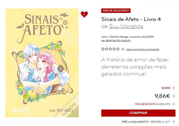A apaixonante série de manga Sinais de Afeto chega ao seu quarto livro, mantendo o charme que conquistou os leitores desde o início. Combinando slice-of-life, romance e amizades, esta edição explora a vida de uma estudante universitária surda e o seu relacionamento com um jovem viajado e encantador.
